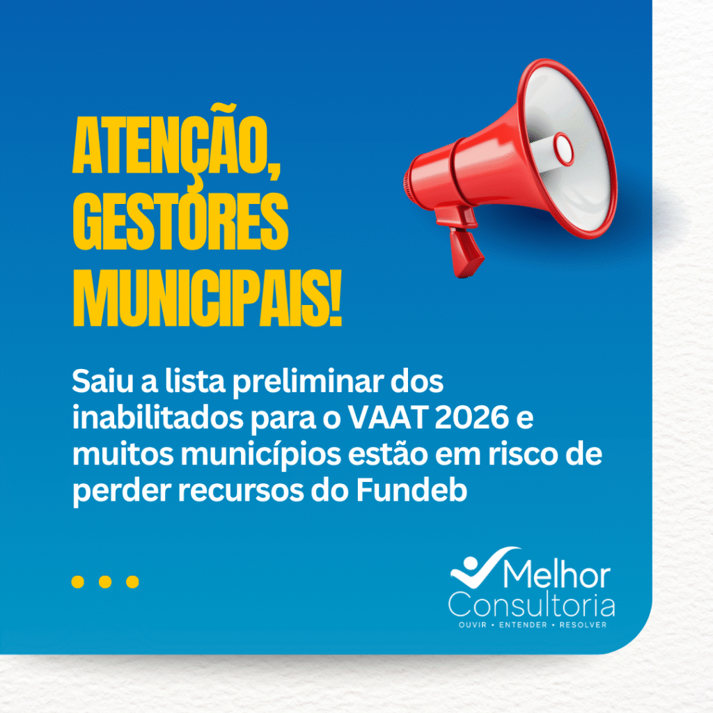 No dia 25 de agosto de 2025, foi publicada a lista preliminar dos entes federativos inabilitados para o cálculo do Valor Aluno Ano Total (VAAT) de 2026. Essa inabilitação pode comprometer o recebimento de recursos do Fundeb, afetando diretamente o financiamento da educação básica pública.